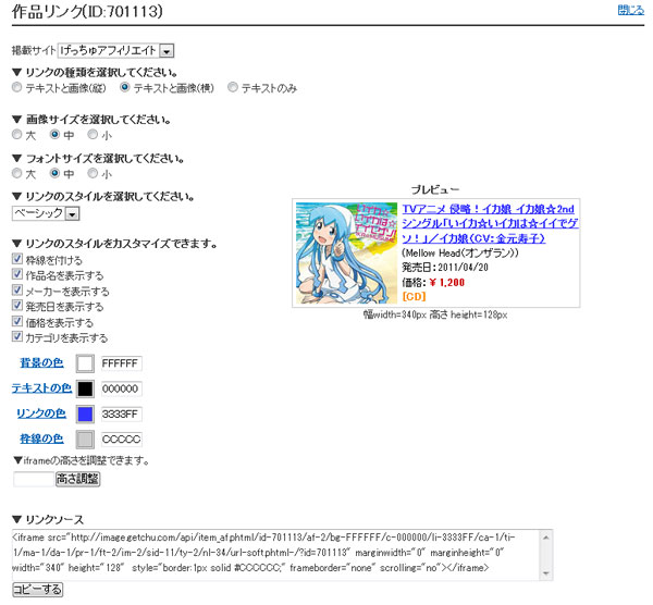 ![]() アフィリエイトパーツは大きく分けて3種類がございます。 1.商品リンクバナー…商品1点毎に設置が可能なパーツです。 [カスタマイズ画面のサンプル]…画像サイズやフォントサイズ、背景の色、テキストの色、リンクの色、枠線の有無、表示情報の選択などが可能です。 ![]() 1-1.商品リンク(テキストタイプ)…記事内のテキストリンクなどに向いています。 1-2.商品リンク(縦型タイプ)…ブログのメニュー、サブメニューなどの縦長い箇所に向いています。 ※画像のみの表示も可能です。 1-3.商品リンク(横型タイプ)…ブログ記事の下などの設置に向いています。 2.バナーリンク…Getchu.comにて提供されるバナーです。 貼りたいバナーを選んで、ソースを貼ることで表示されます。表示サイズやリンク先は好みに応じて選べます。定期的に追加、更新されます。 3.サーチボックス…Getchu.comで検索が可能な検索フォームをご自分のサイトに置くことができます。 |